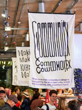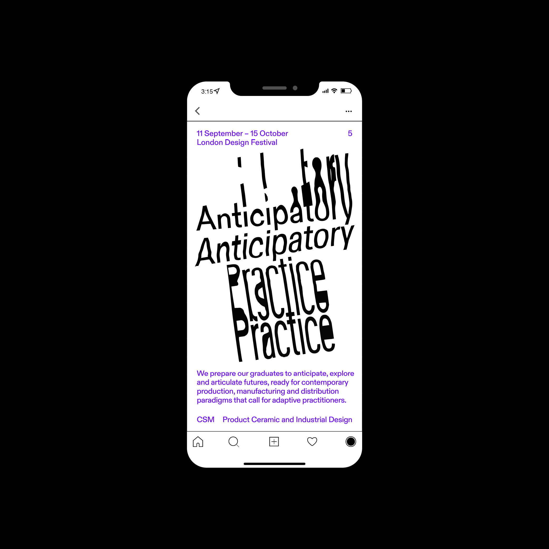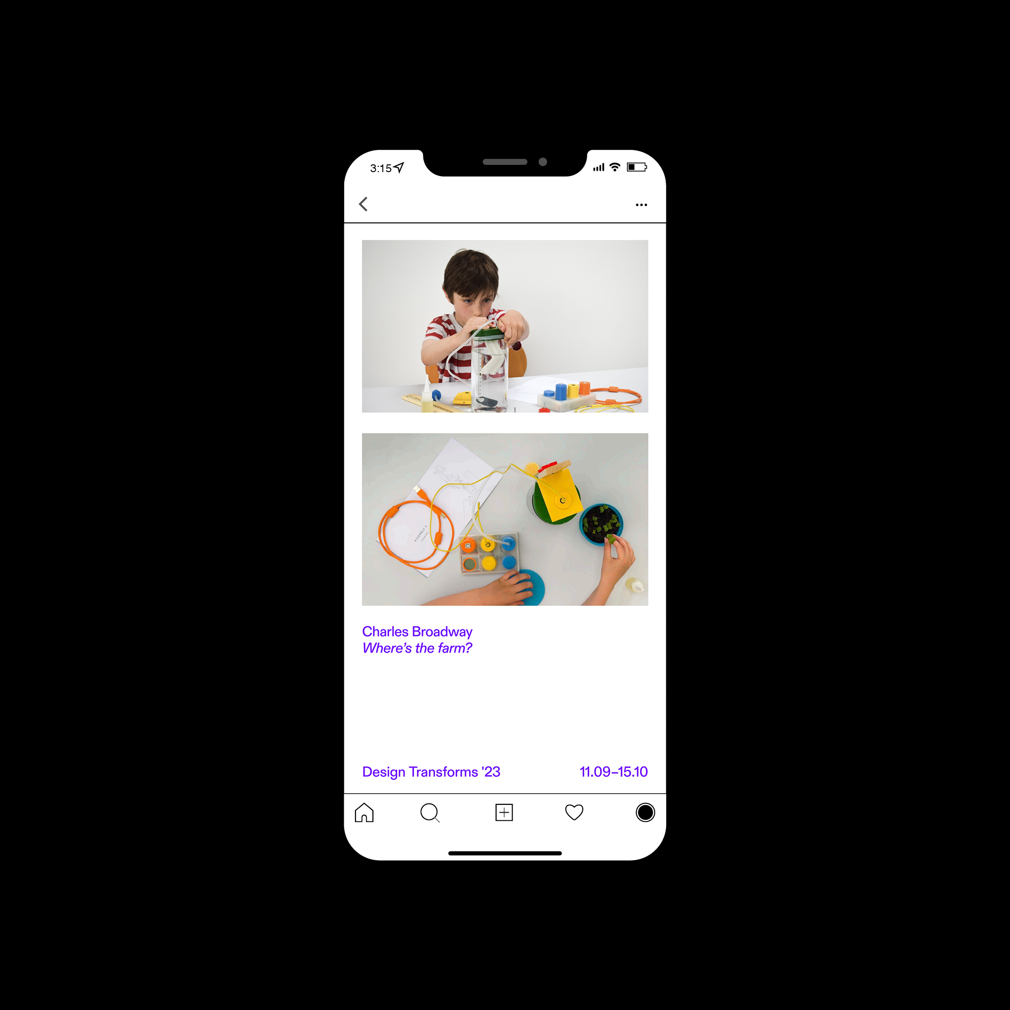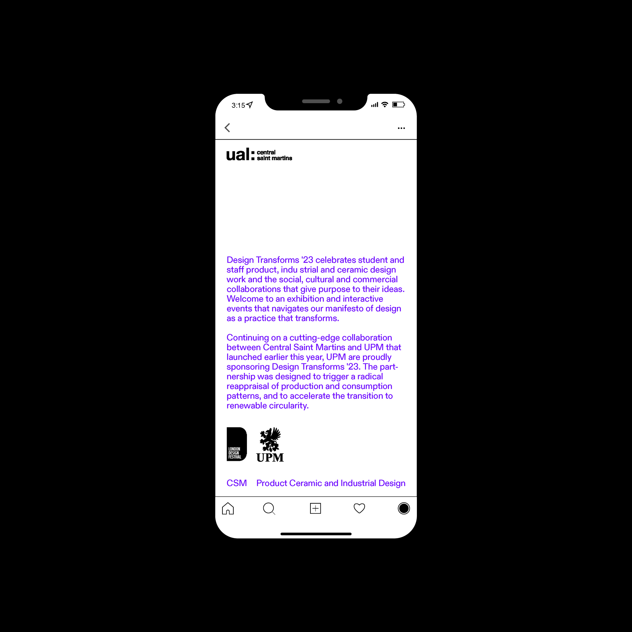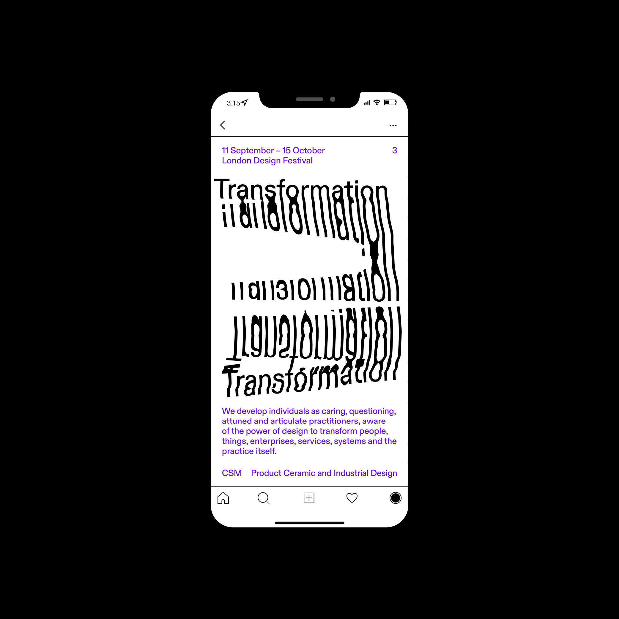 EN Design Transforms is an initiative that celebrates student and staff projects from the Product, Ceramic and Industrial Design programme at Central Saint Martins. Though all their courses work in the world of things, the connections between people and the world are the actual focus of this exhibition. It’s through the materials, processes and techniques that the different courses within the programme work towards positive social impact. The visual identity of the exhibition was infused with art school ethos. The titles of the Design Transforms manifesto were subjected to a typographic treatment suggesting fluidity and experimentation, trying to convey a series of practices in flux. The design manifested itself through a number of physical and digital assets, from physical signage to flags, screens and social media.